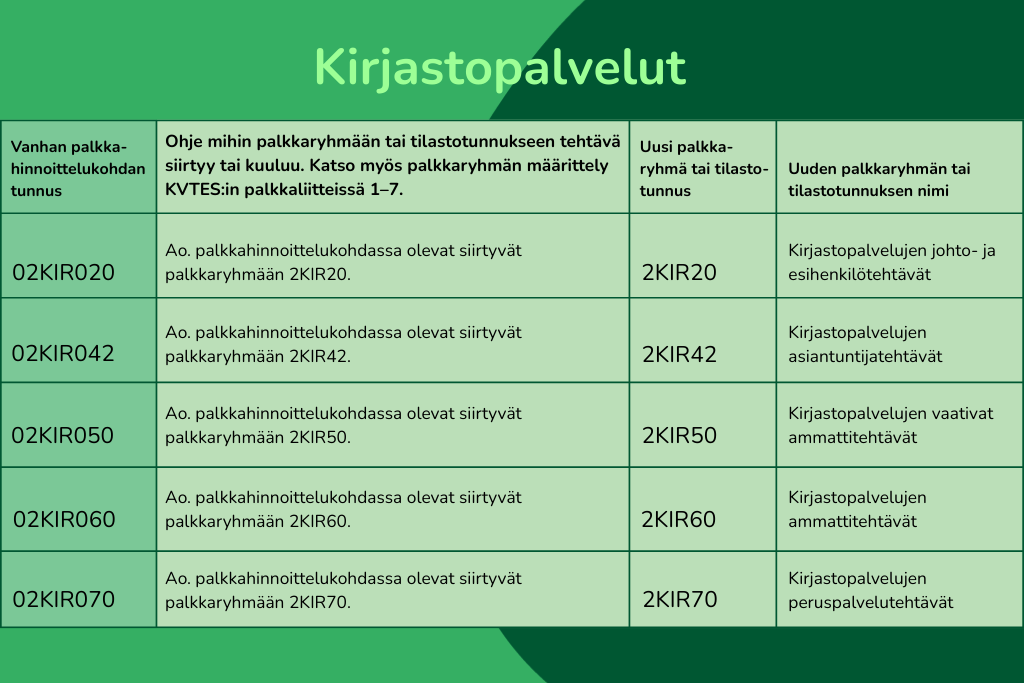 Palkkahinnoittelukohdat ovat jatkossa palkkaryhmiä, jotka löytyvät KVTESin palkkaliitteistä, kuten tähänkin asti. Pääsääntöisesti sovelletun palkkahinnoittelukohdan kaikki tehtävät siirtyvät vastaavaan palkkaryhmään. Alla esimerkkinä liitteeseen 2 sijoittuvien kirjastopalvelujen palkkaryhmät.