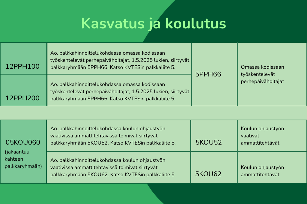 Oikea palkkaryhmä valitaan työtehtävien perusteella. Palkkaryhmien kuvaukset valtakunnallisine tasokriteereineen löytyvät KVTESin liitteestä 1.