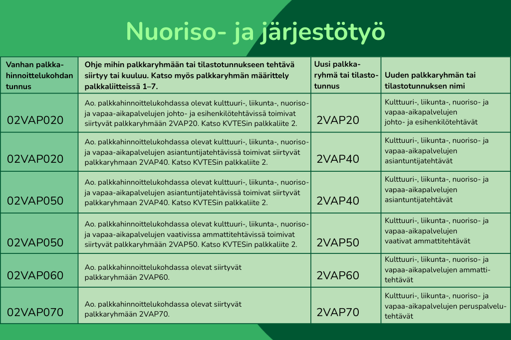 Liitteeseen 2 sovittiin uudistuksen yhteydessä uusi palkkaryhmä 2VAP40, johon voidaan sijoittaa aiemmin palkkahinnoittelukohtaan 02VAP020 tai 02VAP050 sijoitettu tehtävä.