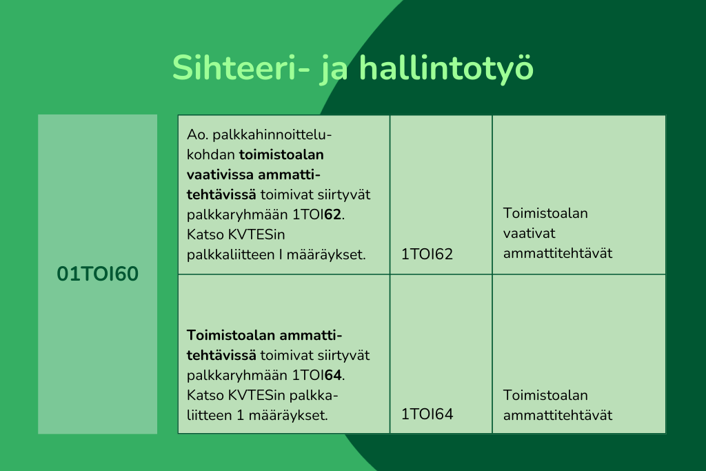 Aiempi palkkahinnoittelukohta 01TOI060 jaettiin uudistuksen yhteydessä kahteen palkkaryhmään: toimistoalan vaativiin ammattitehtäviin (1TOI62) ja toimistoalan ammattitehtäviin (1TOI64).